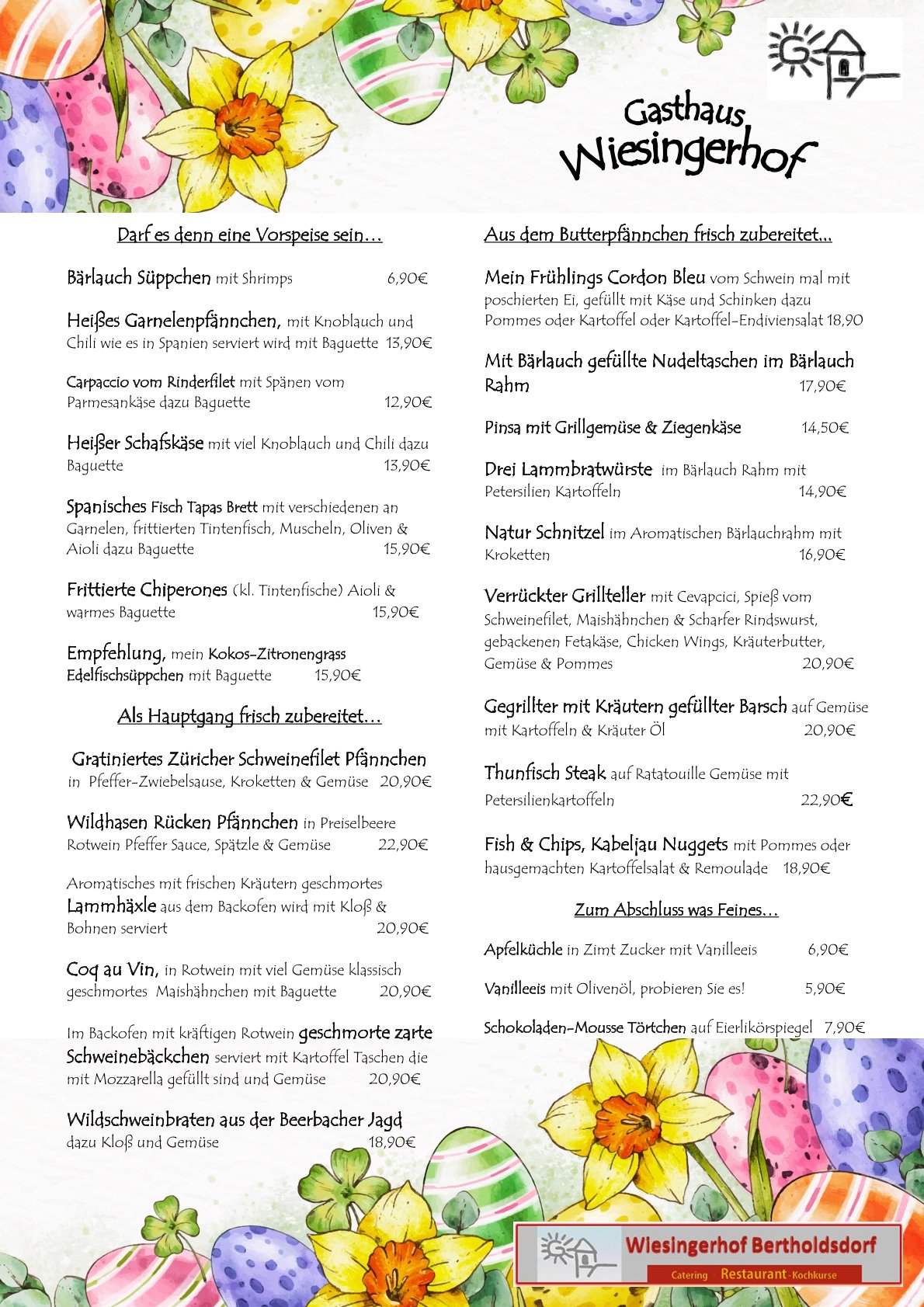 Tradition und Zukunft in stimmiger Kombination finden Sie im Wiesingerhof. Unsere hellen und schönen Räume ebenso wie unsere Gartenterrasse bieten unseren Gästen viel Platz zur Entspannung und zum Genuss. In unserer Küche arbeitet Elisabeth Wiesinger jeden Tag aufs Neue daran, Sie glücklich zu machen. Und auch unser Servicepersonal freut sich, wenn wir Ihnen etwas Gutes tun können. In Bertholdsdorf und der Region sind wir die erste Adresse für ausgefallene Fleisch- und Fischgerichte in hoher Qualität. Unsere Neuinterpretation traditioneller Gerichte bietet Ihnen zu jeder Zeit eine abwechslungsreiche Auswahl schmackhafter Speisen ganz nach Ihrem Geschmack.
